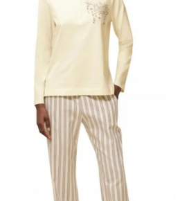 „Triumph Sets Pk 10 X” to damski komplet piżamowy wykonany głównie z bawełny organicznej lub mieszanki bawełny i modalu. Komplet składa się z długich spodni z szeroką gumką w pasie oraz topu z krótkim lub długim rękawem i okrągłym lub owalnym dekoltem.