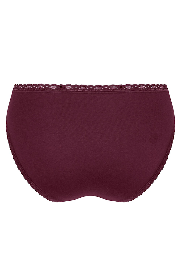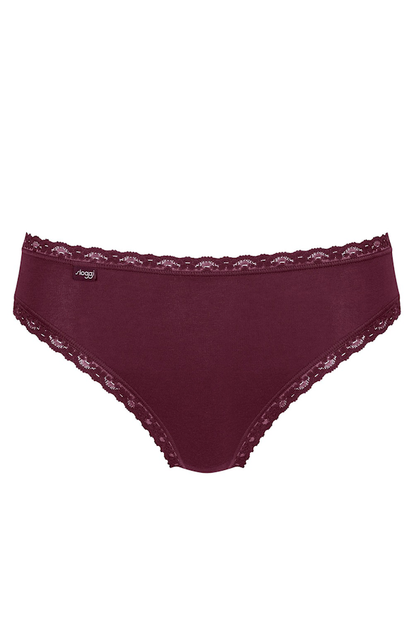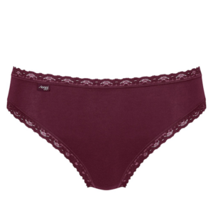 Bardzo wygodne, miękkie, bawełniane majtki typu Tai z wysokim stanem i mocno wyciętymi nogawkami, obszyte koronką w pasie i na nogawkach, wyjątkowo przyjemne w dotyku biodrówki marki Sloggi. Model wykonany w całości z gładkiej bawełnianej dzianiny bardzo wysokiej jakości.