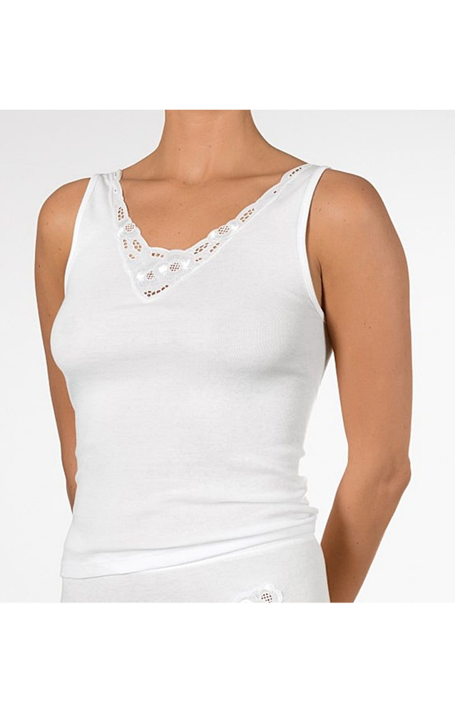 Bawełniany podkoszulek bez rękawów Viania w 100% bawełny. Gładki podkoszulek z ozdobną wstawką z koronki przy dekolcie