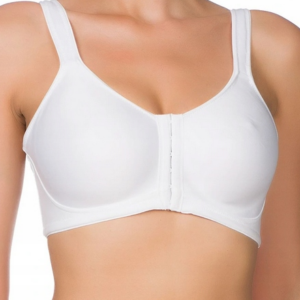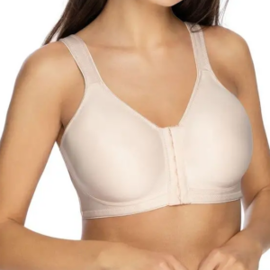 • Biustonosz zapinany z przodu, z wysokim mostkiem i dużą ilością  haftek.