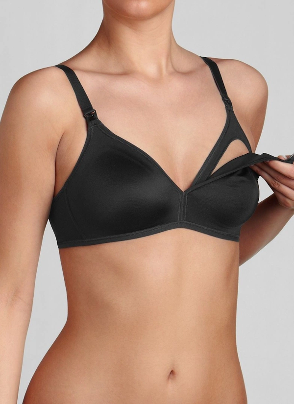 Wyjątkowo wygodny gładki biustonosz do karmienia bez fiszbin, z usztywnianymi miseczkami. Biustonosz wykonany jest z oddychającego materiału mikrofibry, miseczki z zewnętrznej strony podszyte bawełną.