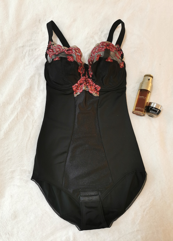 Body z głębokimi miseczkami z fiszbinami. Body o średnim stopniu modelowania ze wzmocnieniem okolic brzucha.