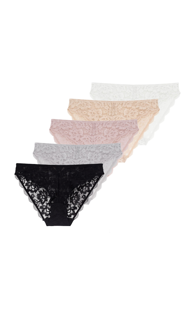 Dorina Myla koronkowe figi typu Tai, z wyższym stanem i wąskimi bokami, pakowane po 5 sztuk, w kolorach różowym, cielistym czarnym, popielatym i ecru