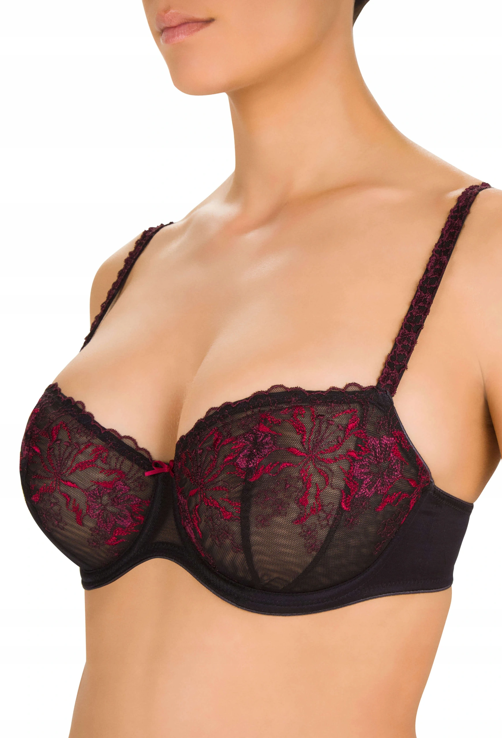 Biustonosz z miękkimi miseczkami, wykonanymi z tiulu, ozdobionymi kolorowymi haftami.