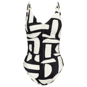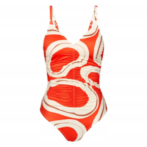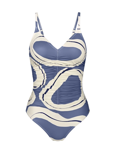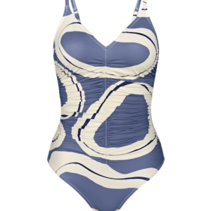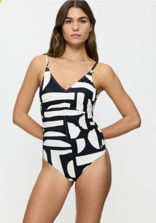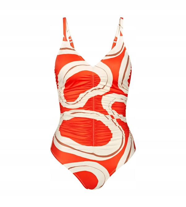 Jednoczęściowy strój kąpielowy delikatnie modelujący kobiecą sylwetkę z lekko usztywnianymi miseczkami, z klasycznym dekoltem w literze V, pięknie podkreślającym kobiece walory.