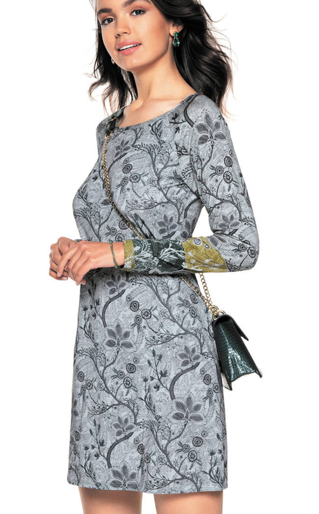 Przepiękna sukienka w kolorze jeansowym wykonana z naturalnej, oddychającej wiskozy ozdobiona pięknym nadrukiem o roślinnym motywie