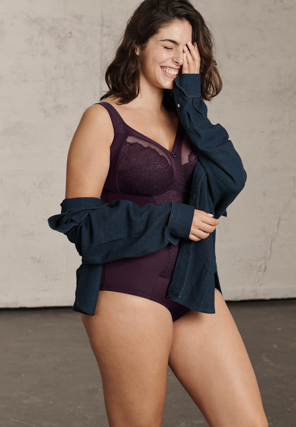 Body z trójkątnymi koronkowymi miseczkami bez fiszbin. Body o wysokim stopniu modelowania sylwetki, szczególnie w okolicach brzucha. Body pięknie wyszczupla brzuch, talie, boki; podnosi i modeluje pośladki.