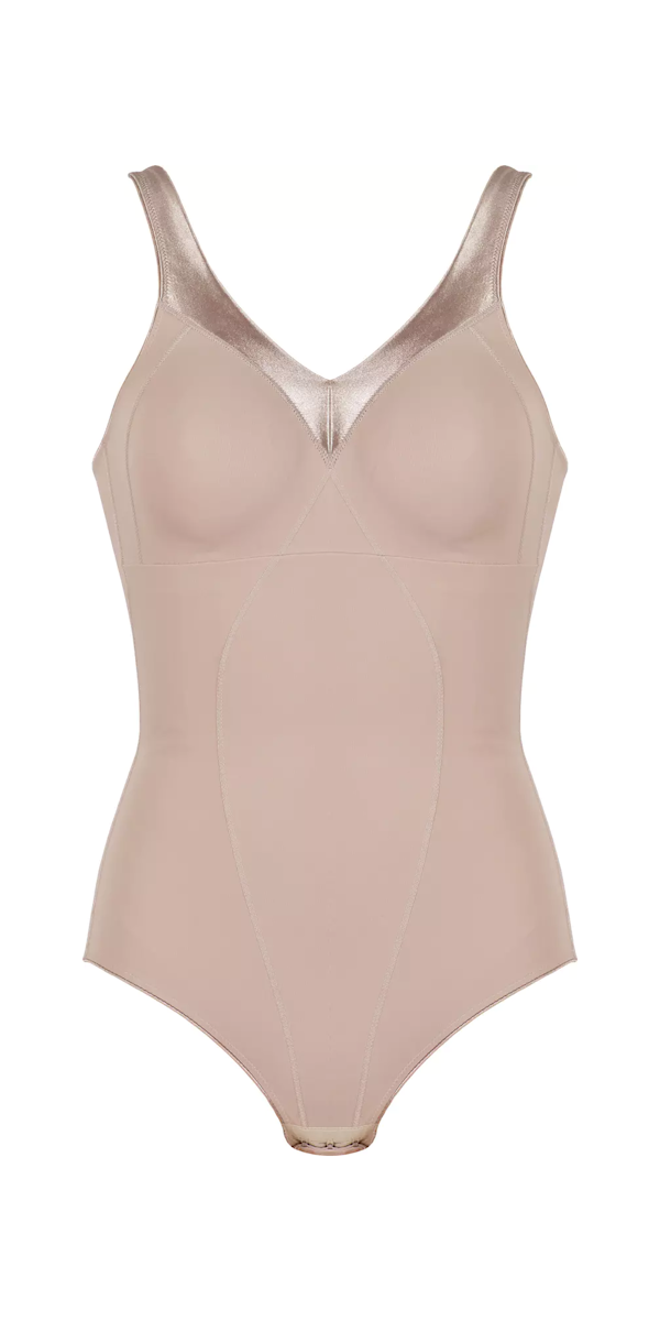 Body z trójkątnymi gładkimi miseczkami bez fiszbin. Body o średnim stopniu modelowania. Body pięknie wyszczupla brzuch, talie, boki; podnosi i modeluje pośladki.