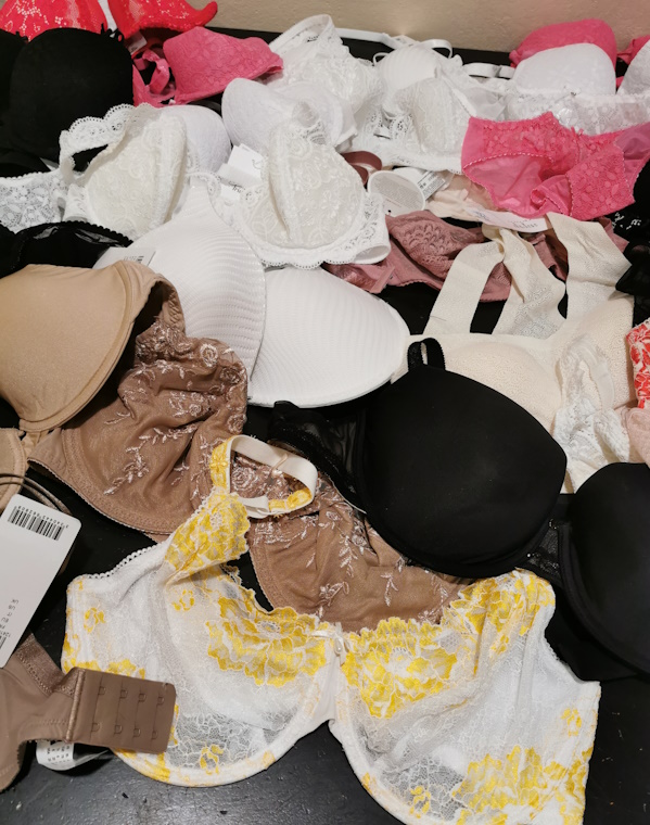 Dużo lekko usztywnianych biustonoszy z fiszbinami: miseczka typu spacer, koronkowe biustonoszy, biustonosze zapinane z przodu.