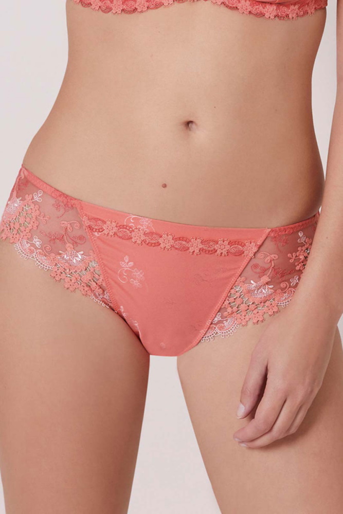 Simone Perele Wish 12B720 to wygodne, jednocześnie ozdobne figi o kroju Tai z wysokim wcięciem w okolicy bioder, średnio-zabudowanym tyłem i stanem na średniej wysokości.