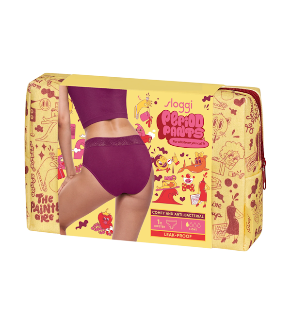 Towar nowy, Sloggi Pariod Pants Hipster – menstruacyjne majtki z wysokim stanem, pakowane w kosmetyczkę.