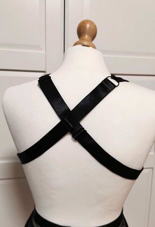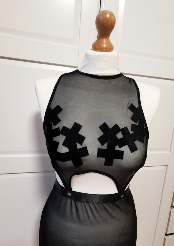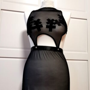 Sukienka erotyczna BDSM – krótka sukienka wykonana z przezroczystego tiulu w połączeniu z gładkimi czarnymi gumkami, srebrnymi zatrzaskami i welwetowymi krzyżykami.