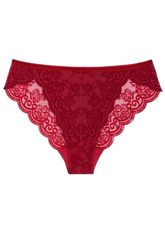 Triumph Amourette 300 Rococo Highleg Brazilian to lekkie figi o fasonie biodrówek z pięknej, płaskiej koronki z aksamitnym zdobieniem. Figi nie będą się odznaczać pod ubraniem.