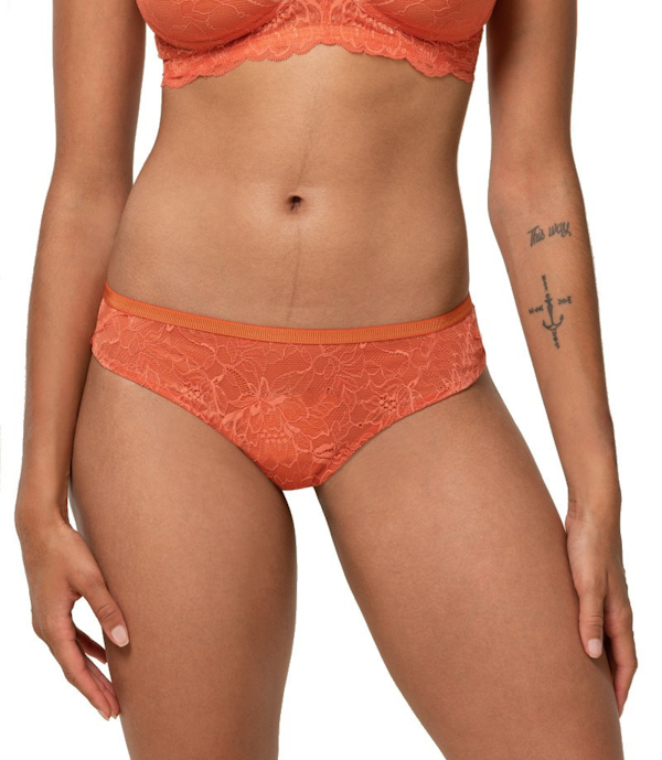 • Wysokie wycięcia na nogi, wykończone płaska lamówką z przodu i falowaną koronką  z tyłu majteczek zapewniając bezszwowy efekt, nieodznaczający się pod ubraniem.