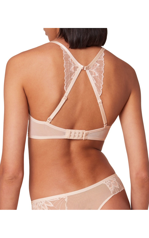Biustonosz na fiszbinach z usztywnionymi miskami, wykonanymi z delikatnej termicznie formowanej pianki, obszytej płaską, nieodznaczającą się koronką.