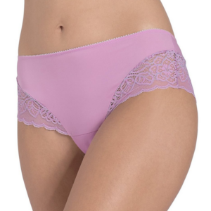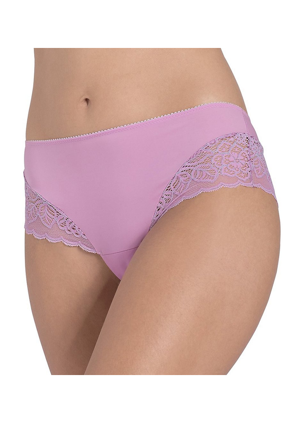 Model z średnio obniżonym stanem i szerokimi bokami. Majtki wykonane z pięknej, delikatnej, oddychającej koronki, w połączeniu z elastycznym gładkim materiałem z przodu oraz tylu.  Nieco przezroczyste boki nadają modelowi lekkości i seksownego wyglądu, wizualnie wydłużając nogi.