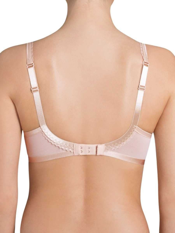Tył – jest gładki, wykonany z mocnego, gładkiego, elastycznego tiulu w kolorze popielatym. Eleganckie płaskie wykończenia: satynowa, połyskująca lamówka na dole, satynowe obszycie u góry – nadają modelowi uroku i nie odznaczają się pod ubraniami.