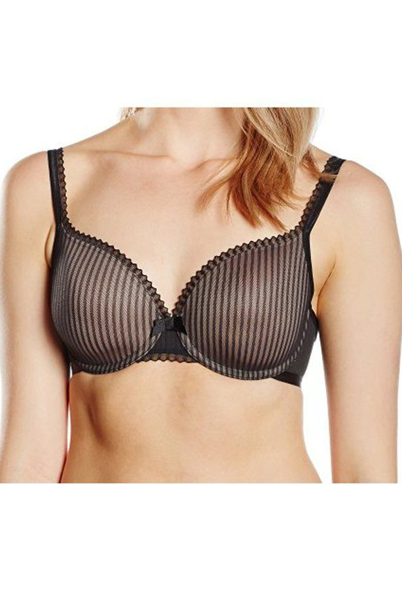 Gładki biustonosz typu T-shirt Bra z usztywnianymi, pełnymi miseczkami na elastycznych 3D fiszbinach, które dopasowują się do ruchów ciała. Model z termicznie formowanymi miseczkami bez szwów, które idealnie zbierają i podnoszą biust. Miseczki w kolorze popielatym ozdobione są ażurowym szarym tiulem w pionowe paski. Góra miseczek i przód ramiączek wykończone przepiękną falowana koronką.