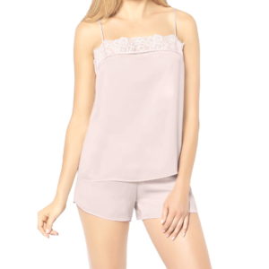 Dwuczęściowa piżama w kolorze blado różowym  –  bluzka na ramiączkach z delikatnej satyny i krótkie szorty.
