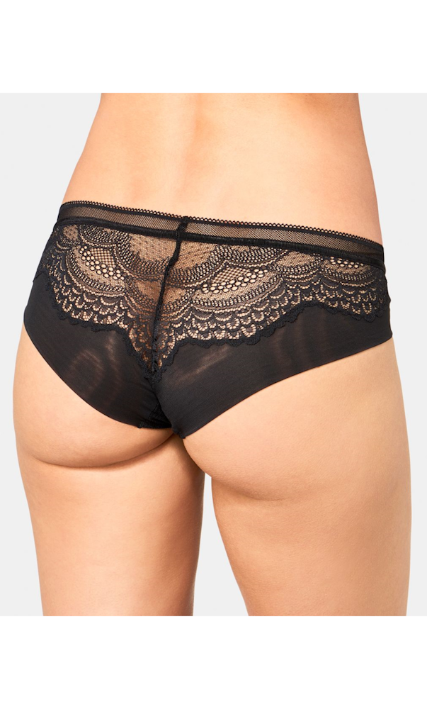 Seksowne majtki typu brazilian tylko w połowie zakrywającym pośladki. Swój uwodzicielski charakter zawdzięczają subtelnej koronce i delikatnemu tiulowi.