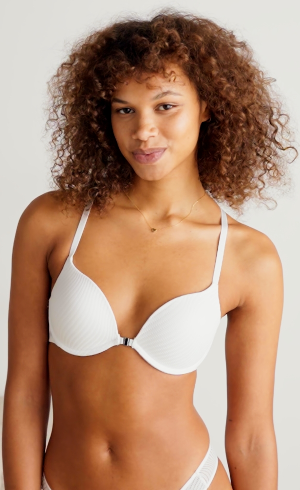 Ultralekki, usztywniany biustonosz typu push-up na fiszbinach z anatomicznie wyprofilowanym wewnątrz pogrubieniem tworzącym efekt pełnego, powiększonego optycznie biustu.