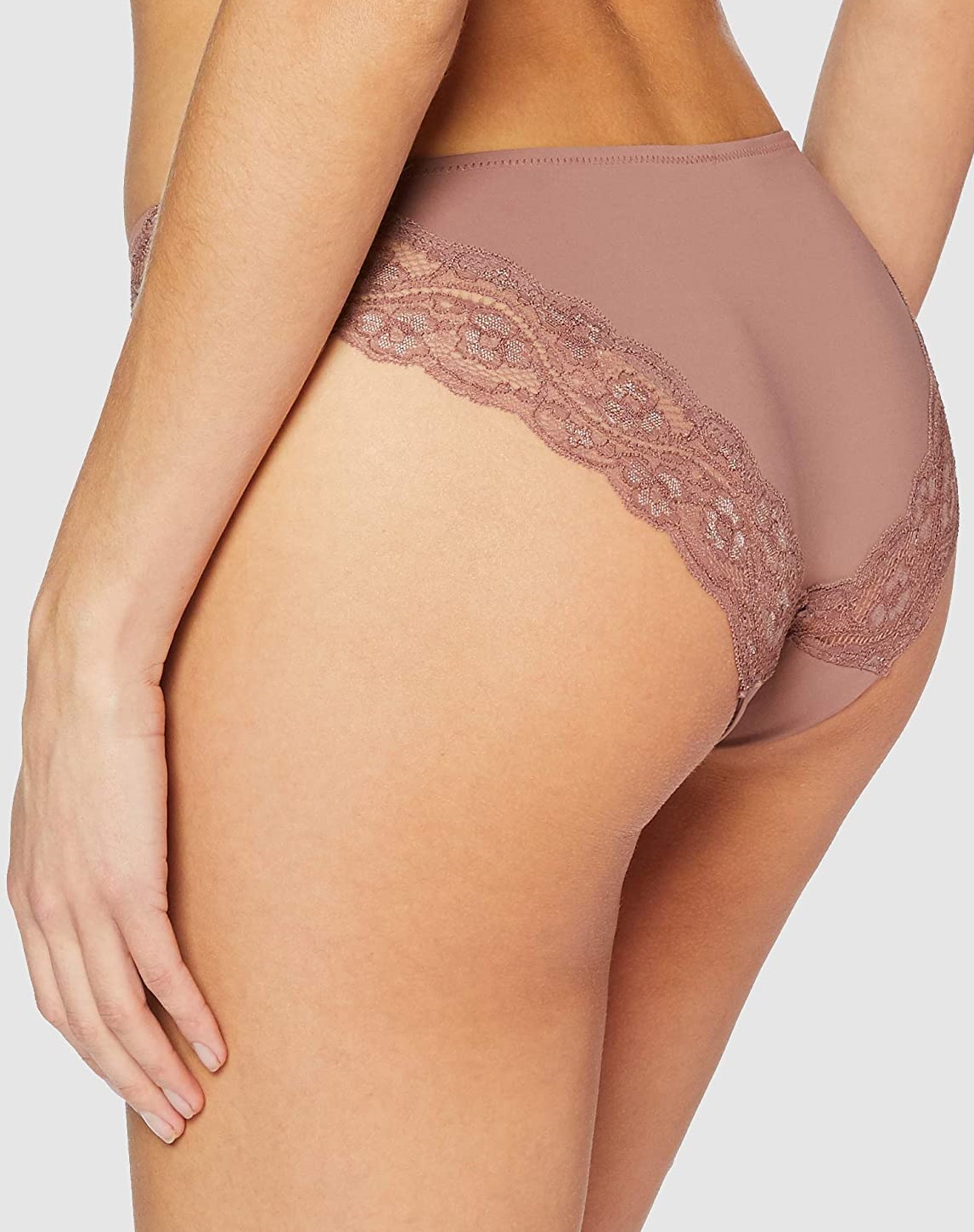 Przód modelu zdobią szerokie paski z koronki z falowanym wykończeniem, na wycięciach na nogi. Na dole model wykonany z gładkiego, elastycznego materiału, podszytego od wewnątrz trykotową wkładką.