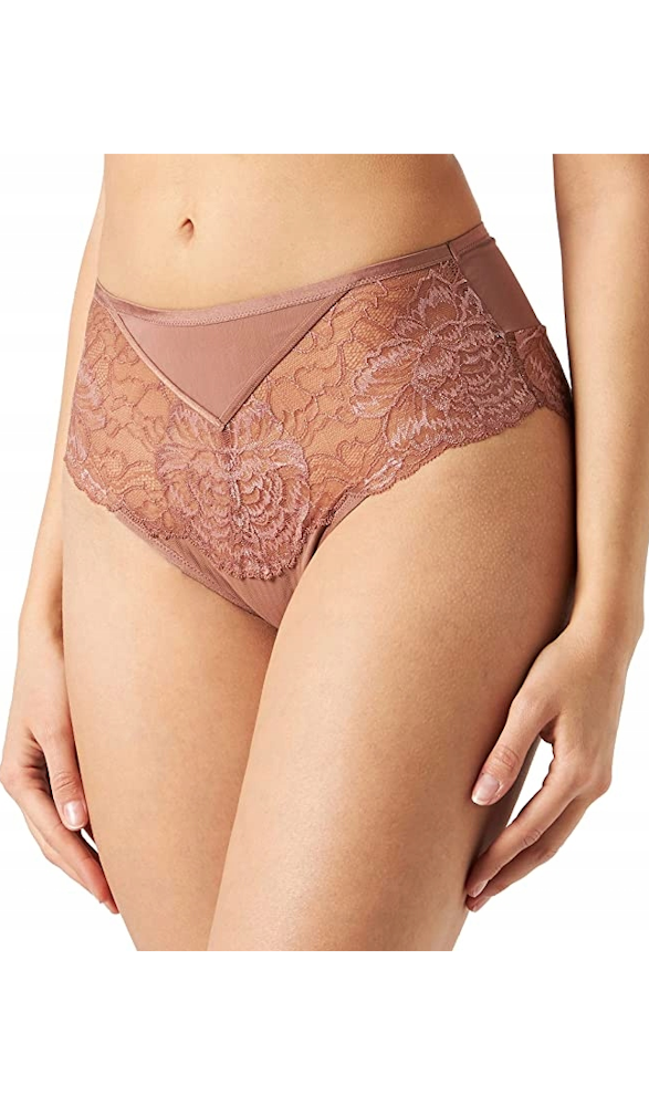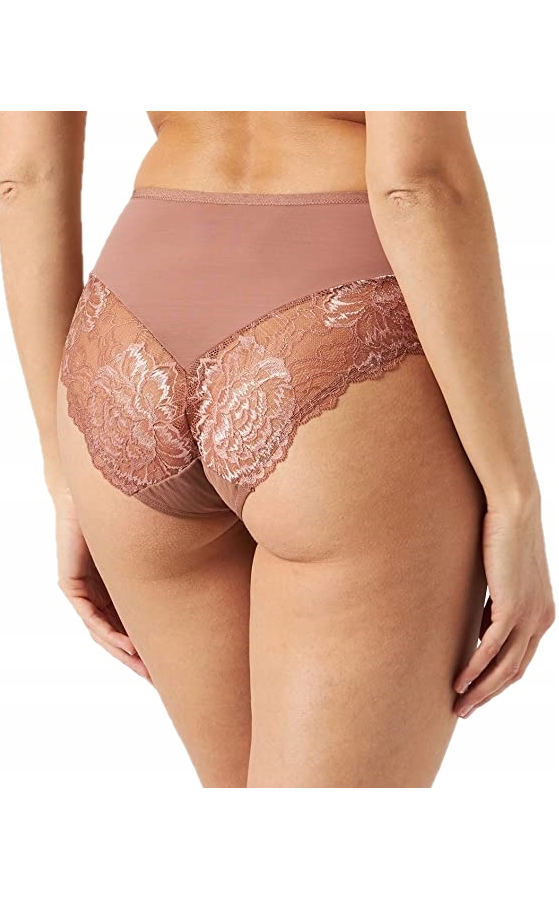 Przepiękne figi z szerokimi bokami z podwyższonym stanem z nowej serii Triumph Florale. Przód majtek zdobi szeroki pas przepięknej koronki z kwiatowym wzorem z falowanymi wykończeniem. Tył wykonany z delikatnego, przezroczystego, oddychającego tiulu, ozdobionego na dole koronką z kwiatowym wzorem z serii Peony Florale.