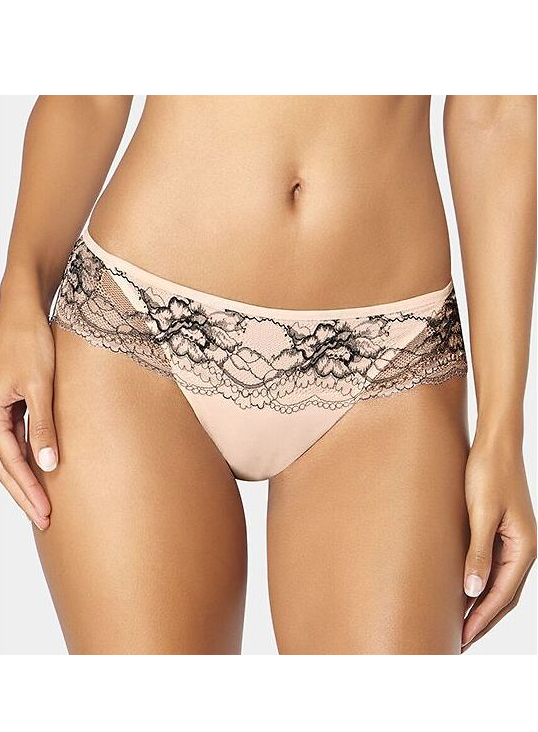Przepiękne figi z szerokimi bokami z obniżonym stanem z nowej serii Triumph Florale. Przód wykonany jest z gęstego jerseyu, góra jest ozdobiona tiulowym paskiem z pięknymi haftami w kwiatowe wzory. Płaska, cienka gumka u góry nie odznacza się pod ubraniem. W kroku wąskie, płaskie gumki. Tył modelu jest ozdobiony pięknym tiulowym trójkątem z haftami oraz szerokimi tiulowymi paskami z haftami z motywem roślinnym na pośladkach.