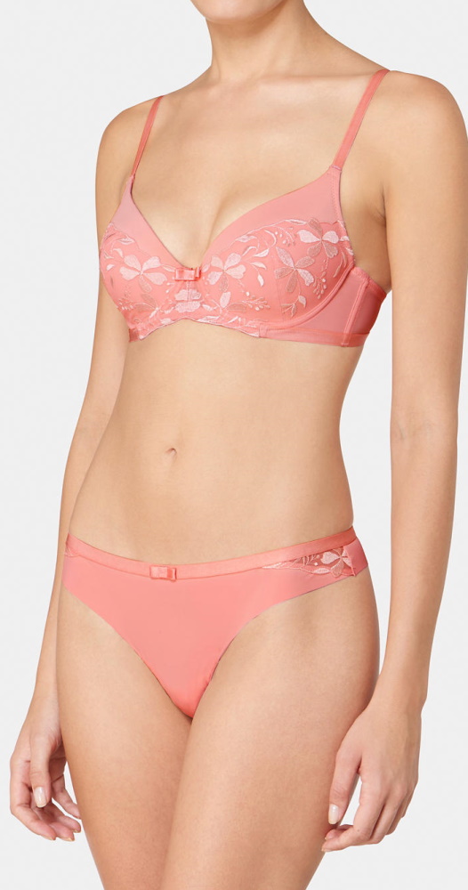 Delikatne, ozdobne majtki o  kroju String –  marki Triumph  z romantycznej serii Sexy Angel. Z przodu model  jest wykonany z gładkiego materiału z haftami z motywem kwiatowym.