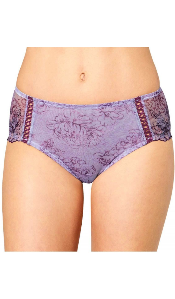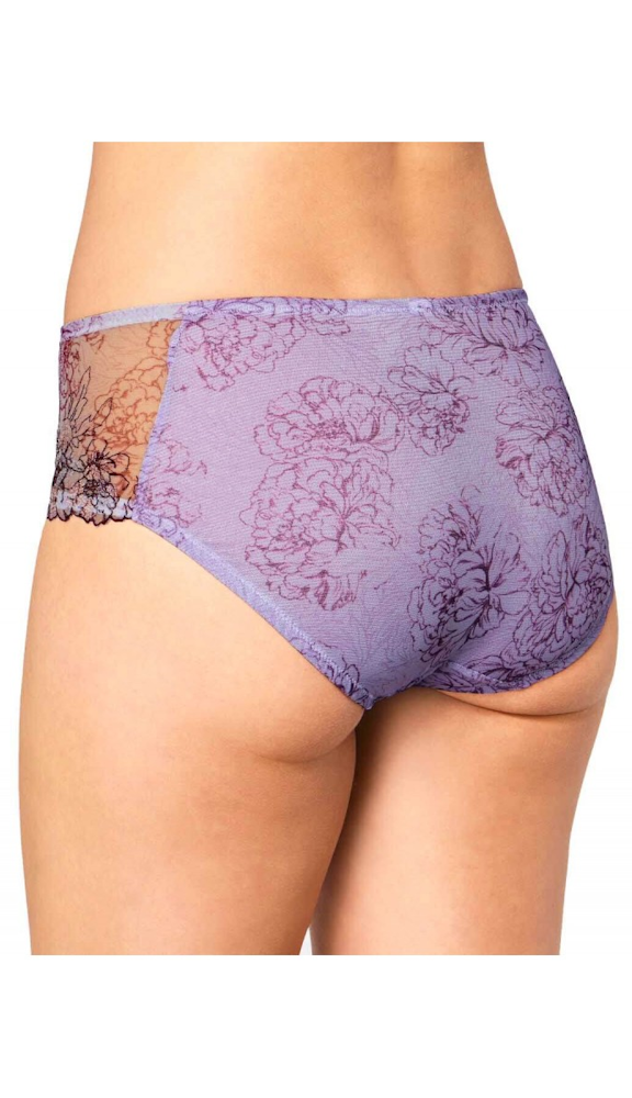 Przepiękne figi z szerokimi bokami, z nowej serii Triumph Florale. Przód wykonany jest z delikatnego tiulu z kwiatowym nadrukiem, ozdobiony po bokach falującym haftem.