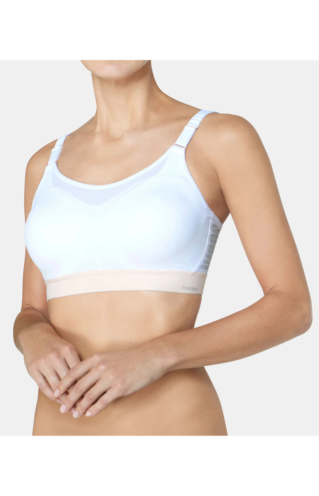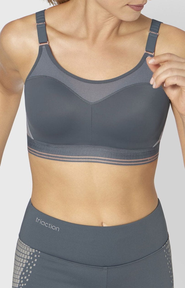 Sportowy biustonosz z modelującymi fiszbinami, dopasowującymi się do każdego ruchu, marki Triumph, z serii Triaction. Dzięki wyjątkowemu kształtowi miseczek biustonosz zapewnia idealne podtrzymanie i stabilizacje biustu podczas bardzo intensywnej aktywności sportowej. Nadaje się dla bardzo aktywnych sportów. Model jest wykonany z mocnego elastycznego materiału, pomiędzy miseczkami znajduje się mocna 2-warstwowa siatka.