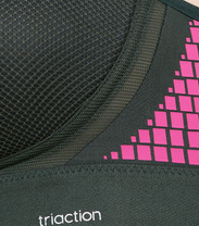 sportowy biustonosz z dopasowującymi się do każdego ruchu miękkimi, lekko usztywnianymi miseczkami bez fiszbin marki Triumph,  z serii  Triaction. Dzięki wyjątkowemu kształtowi miseczek biustonosz zapewnia idealne podtrzymanie i stabilizacje biustu podczas bardzo intensywnej aktywności sportowej. Nadaje się dla  bardzo aktywnych sportów. Model jest wykonany z mocnego elastycznego materiału, pomiędzy miseczkami znajduje się mocna, niezwykle lekka 3D-warstwowa siatka.