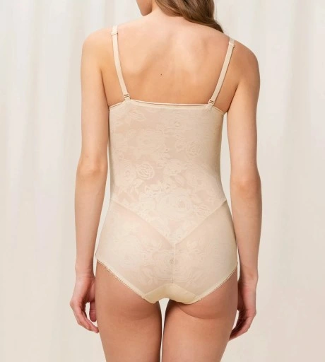 Zapięcie w kroku, na 3 haftki. W kroku wszyta trykotowa wkładka.