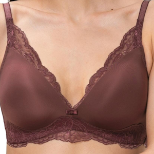 • Bardzo lekki biustonosz z gładkimi, trójkątnymi miseczkami, obszytymi gładkim delikatnym materiałem, z akcentem koronkowym przy dekolcie oraz dołem miseczek.